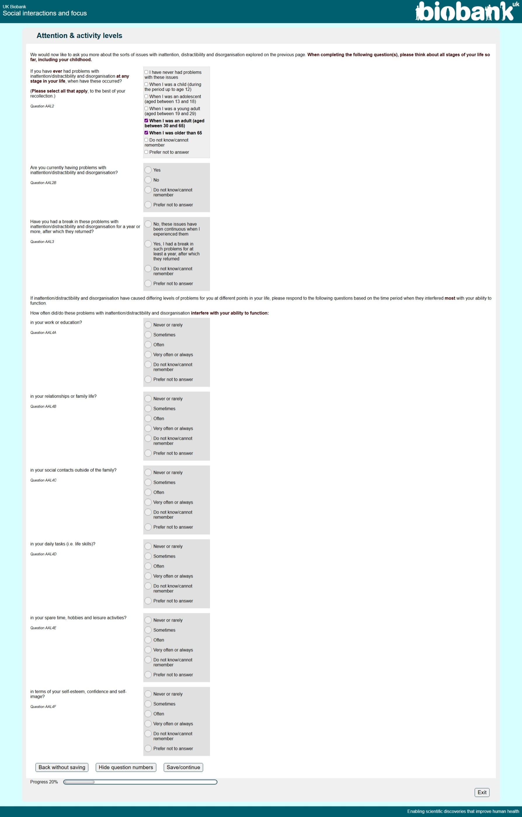 Online Social Interactions and Focus questionnaire screenshot AAL2B, showing appearance as seen by participants circa 2023