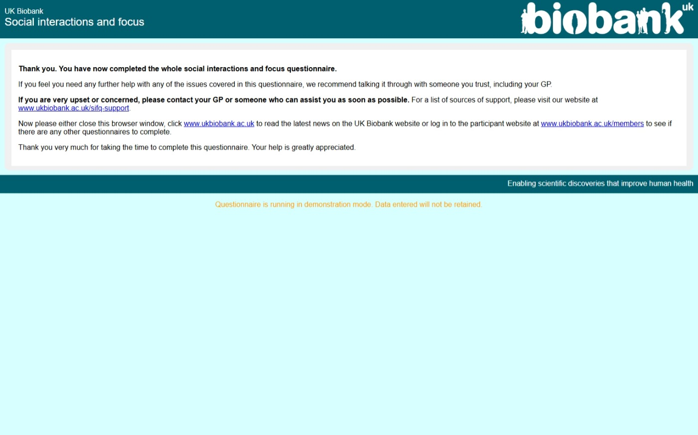 Online Social Interactions and Focus questionnaire screenshot of thank you for completing questionnaire, showing appearance as seen by participants circa 2023