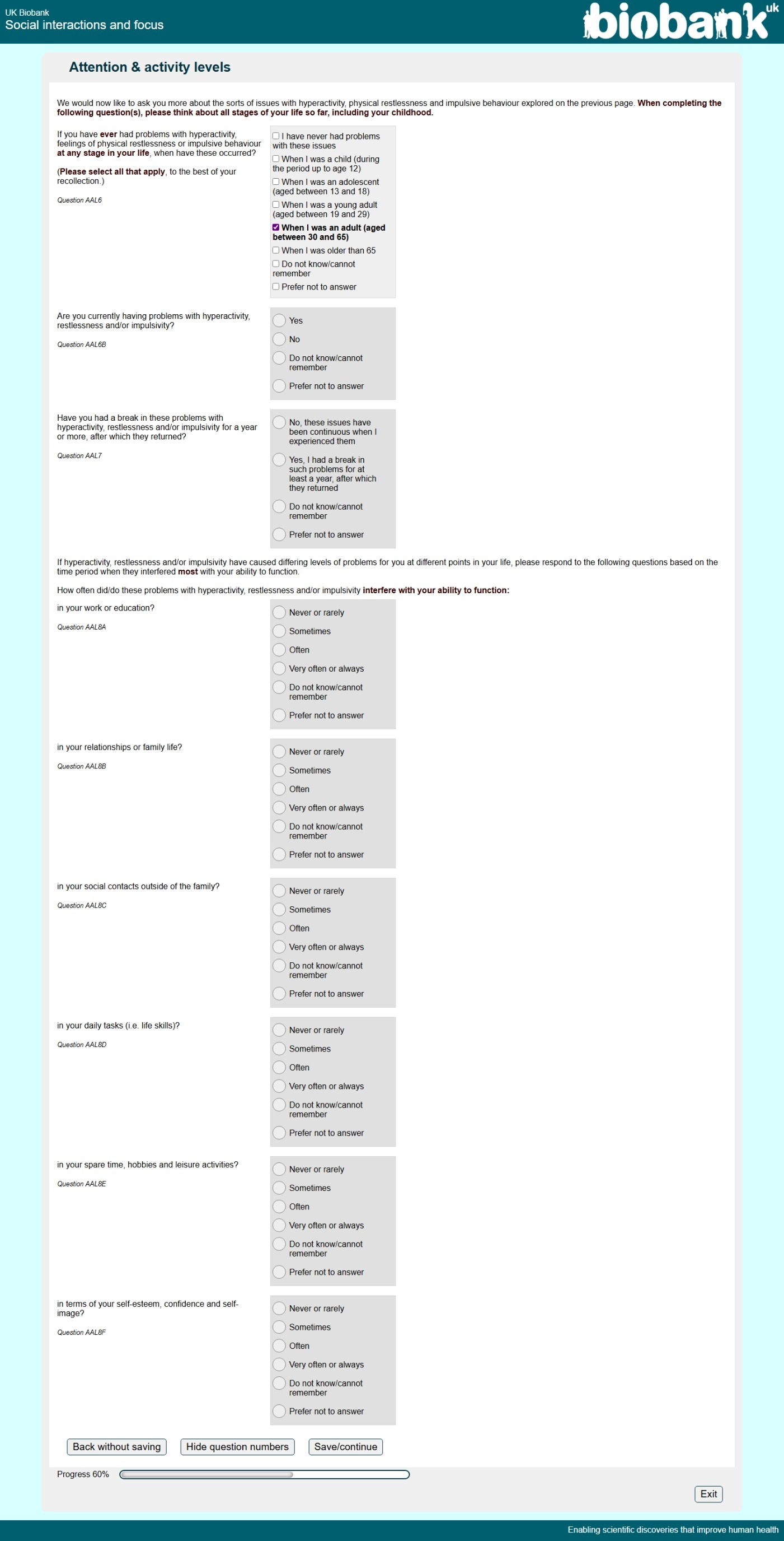 Online Social Interactions and Focus questionnaire screenshot AAL6B, showing appearance as seen by participants circa 2023